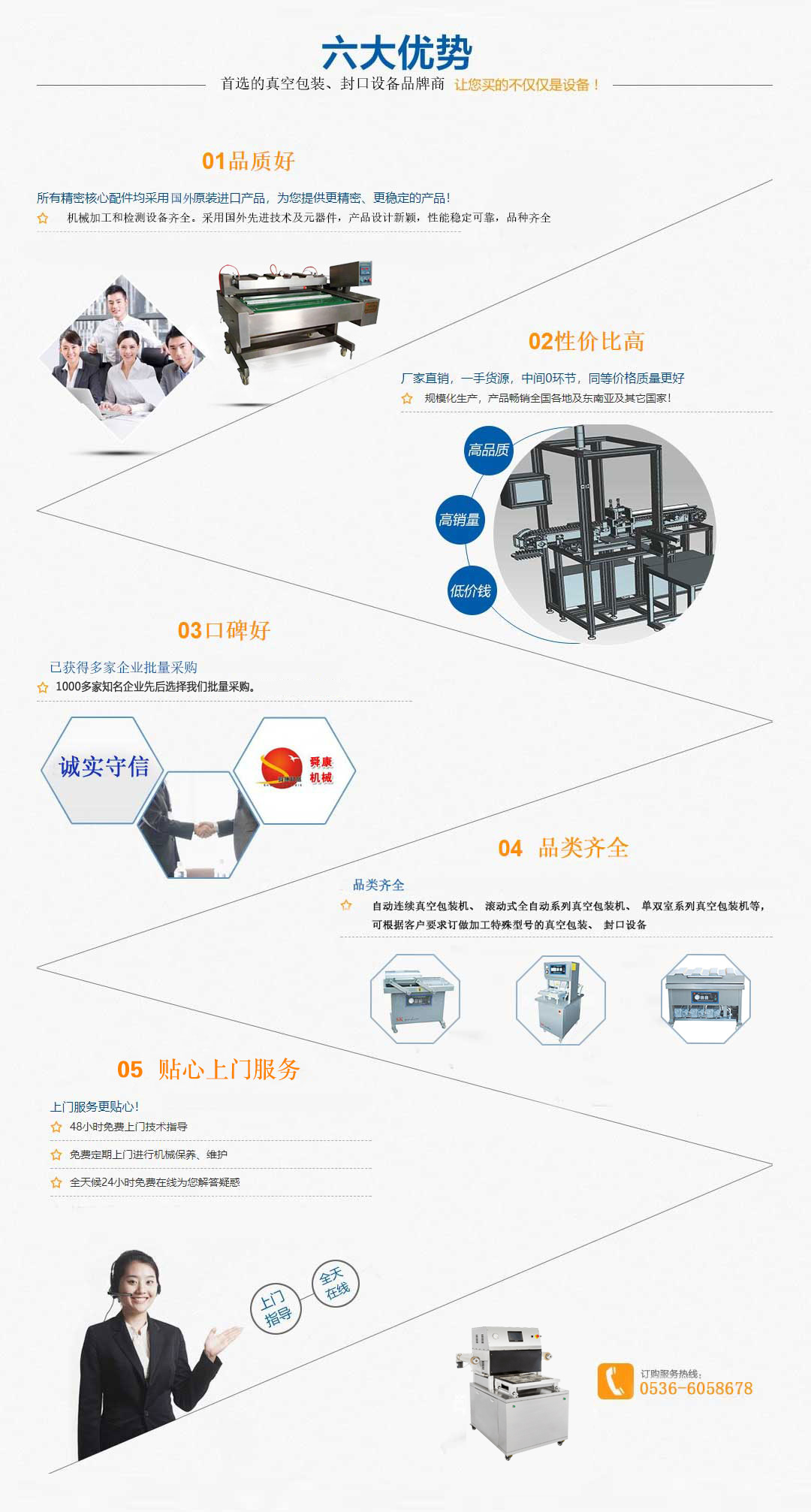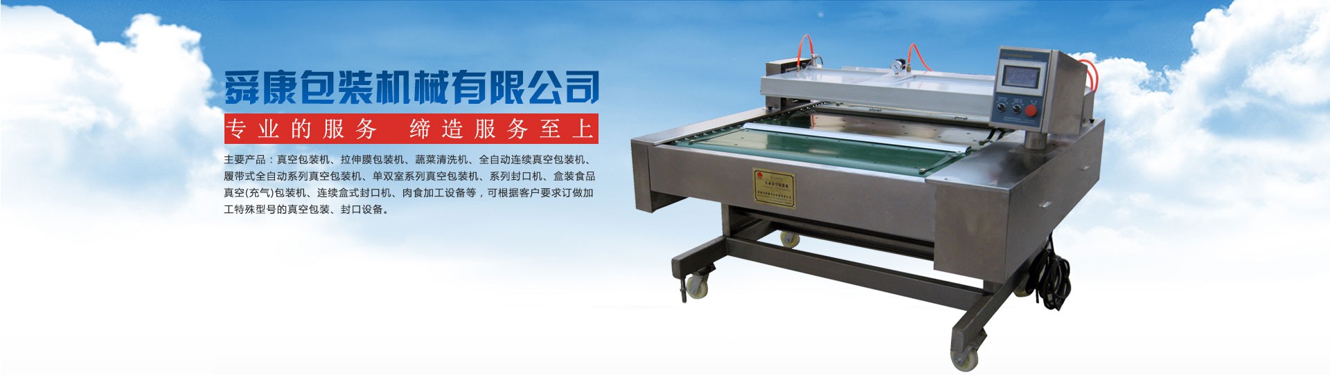 諸城市舜康包裝機械有限公司是一家集研發、制造、銷售、服務于一體的包裝機械生產企業。公司技術力量雄厚,機械加工和檢測設備齊全。采用國外先進技術及元器件,產品設計新穎,性能穩定可靠,品種齊全。 主要產品:自動連續真空包裝機、滾動式全自動系列真空包裝機、單雙室系列真空包裝機、系列封口機、盒裝食品真空(充氣)包裝機、連續盒式封口機、肉食加工設備等,可根據客戶要求訂做加工特殊型號的真空包裝、封口設備。 舜康公司堅持“科技為本,質量先行,憑信譽謀發展,靠質量求生存”的經營理念,為廣大客戶朋友提供優異的產品與服務。 舜康熱忱歡迎廣大國內外客戶朋友蒞臨參觀指導。...